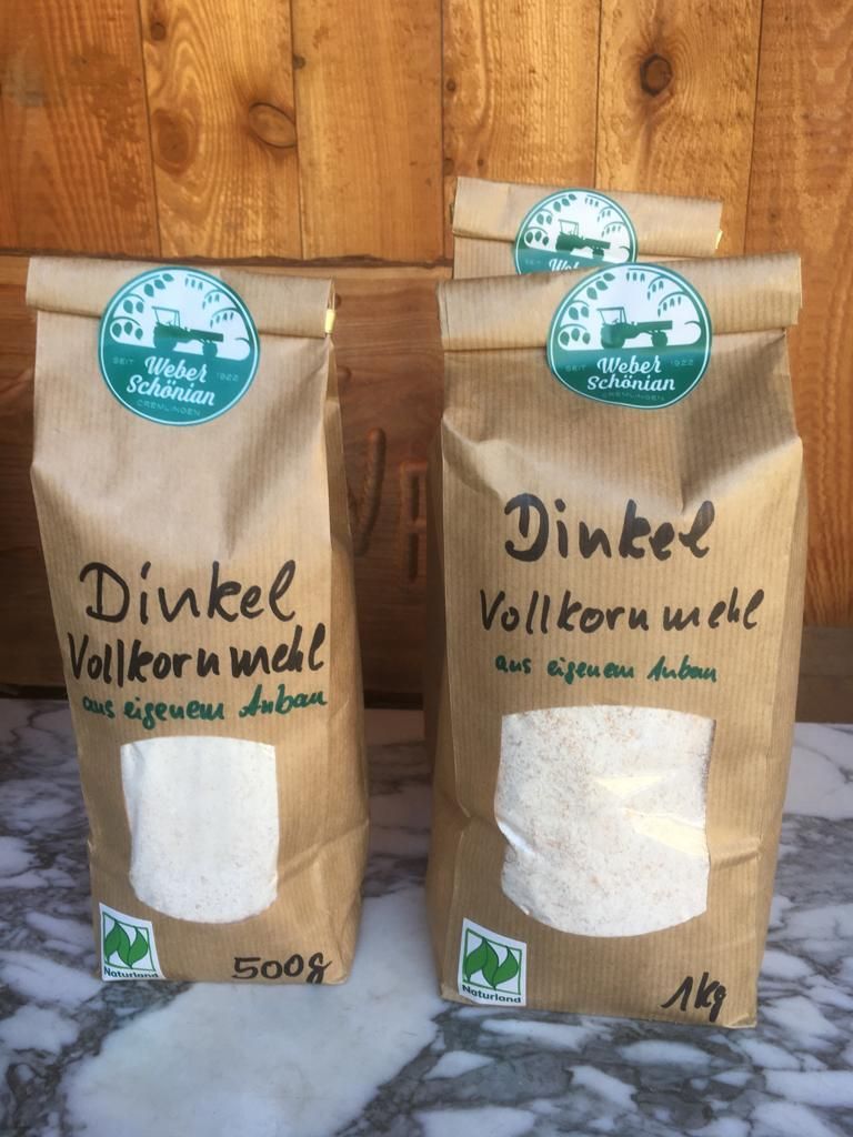 Wir bieten unseren Bio-Dinkel im ganzen Korn oder als frisch gemahlenes Vollkornmehl in unserem Hofstand an. Sollten Sie größere Mengen benötigen sprechen Sie uns gerne an!